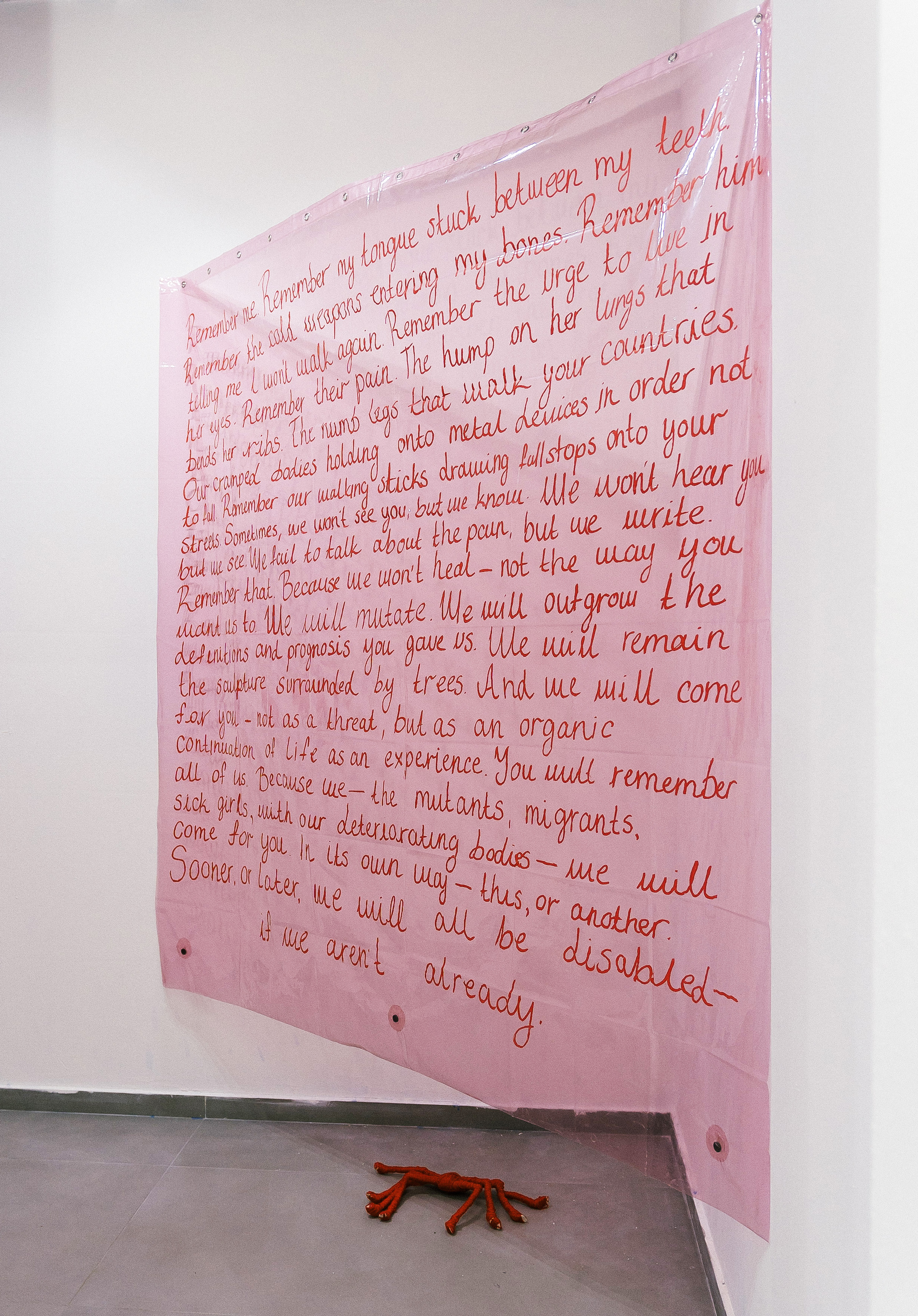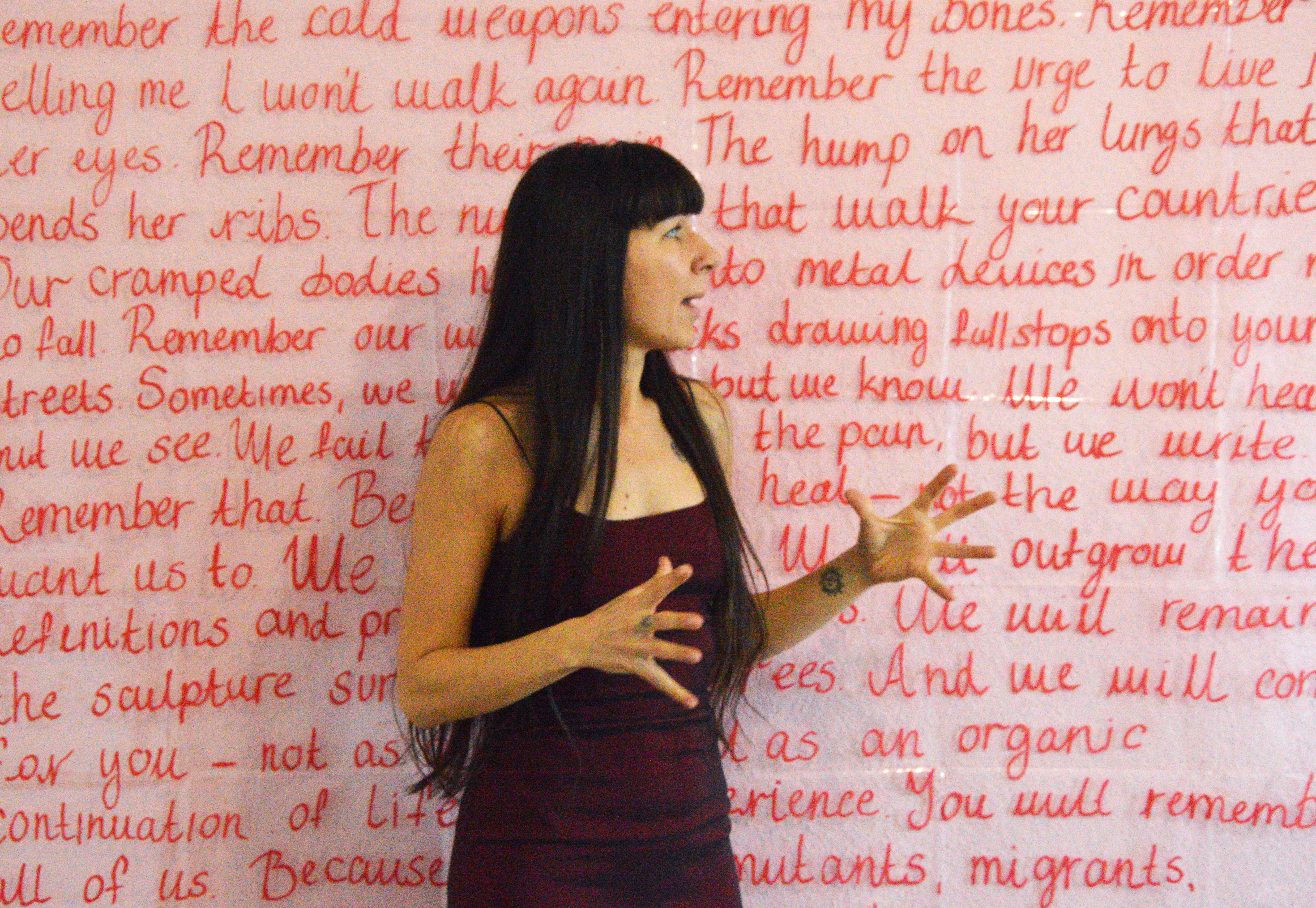 Remember me. Remember my tongue stuck between my teeth. Remember the cold weapons entering my bones. Remember him telling me I won’t walk again. Remember the urge to live in her eyes. Remember their pain. The hump on her spine that bends her lungs. The numb legs that walk your countries. Our cramped bodies holding onto metal devices so we do not fall. Remember our walking sticks drawing full stops on your streets.